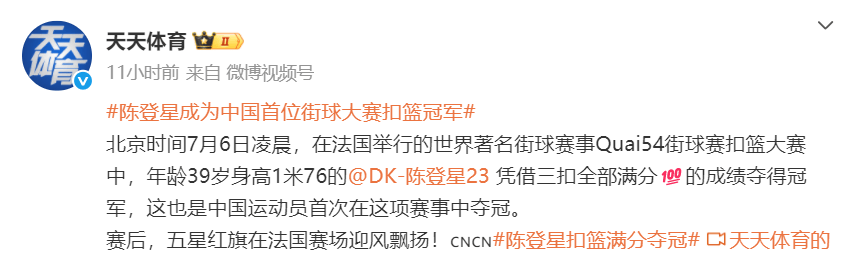 要知道,这可是中国男篮历史上,第一次参加Quai54世界街球锦标赛扣篮大赛。而第一次参赛,陈登星便一鸣惊人,不仅让人刮目相看,而且,还直接拿了一个世界级冠军。对于39岁的陈登星,乃至整个中国男篮而言,这都是一件极为鼓舞的事情。一个39岁的老将,这本该是已经退役的年龄。可陈登星不仅能够在赛场上继续驰骋,而且,还能拿到世界扣篮冠军,这确实是一件匪夷所思的事情。