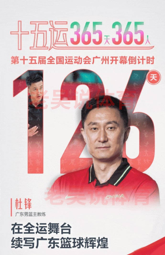 第十五届粤港澳全运会开幕倒计时126天,广东男篮主教练杜锋登上海报封面。