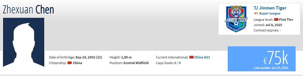北京时间7月8日,德转更新,石家庄功夫中场陈哲宣自由身加盟天津津门虎。