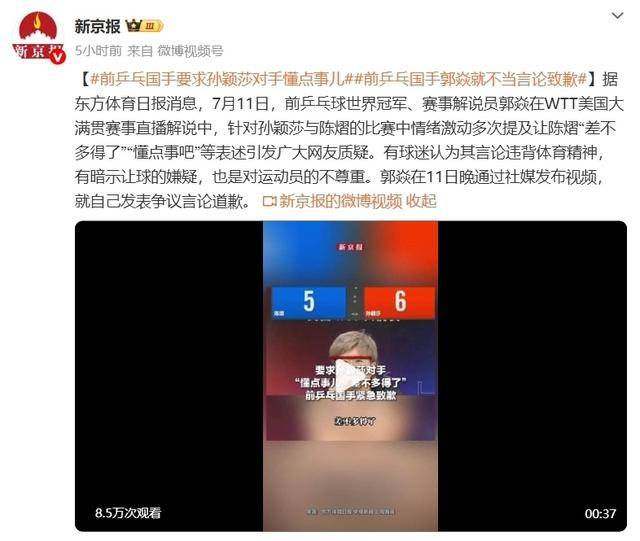 争议在第四局白热化阶段爆发,当陈熠以2:1领先并与孙颖莎紧咬比分时,担任网络解说的郭焱面对千余名观众直言:“陈熠要懂点事,差不多得了。”这句话迅速被网友截取传播,被广泛解读为暗示年轻选手应为“主力让路”,尽管郭焱当晚紧急道歉,称系“情急之下发表的主观臆断”,但舆论漩涡已然形成,7月12日,《新京报》《红星新闻》《大河报》等多家官方媒体集体发声,对这位前世界冠军展开严厉批评