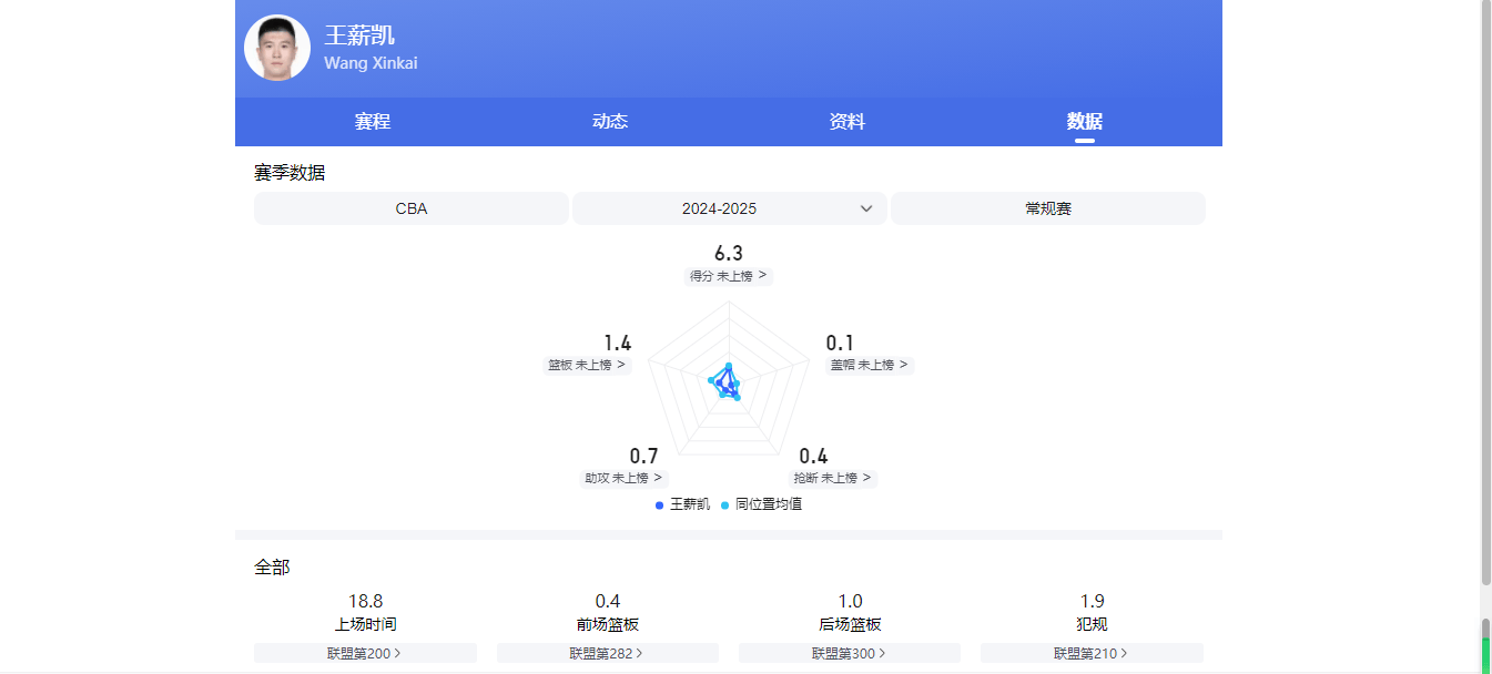 上赛季,他共代表广东队出战17场常规赛,场均可贡献1.5分1.2篮板。