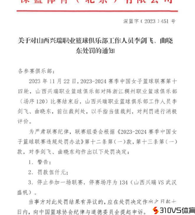 关于这两场竞赛引发的抵触,中国篮协也开出了重磅罚单。对大庆女篮主帅塔西奇罚款1万,停赛2场,取消评奖资历;两俱乐部各罚款5万,取消评奖资历;与此同时,有6名球员被罚款1万、停赛2场、并且取消评奖资历,她们区分是周月明、张亚琪、钱内迪·卡特、陆紫薇、刘纯韶、陈思奇。还有13名球员被罚款罚款5千、停赛1场和正告,区分是:吴爽、曹丽庆、罗怡璐、郑好、王雨薇、马琪蕊、黄金莲、博亚娜·科瓦切维奇、胡玥明、邢金博、方敏、王泽、陈少玲。