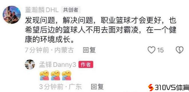 随后,董瀚麟在孟铎的节目评论区宣布评论写道:“发现效果,处置效果,职业篮球才会更好,也希望后边的篮球人不用去面对霸凌,在一个安康的环境生长。”