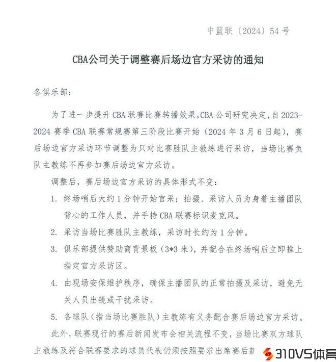 同时,CBA要求主教练接受官方采访时,严厉遵守联赛纪律制度,不宣布违规言论。本赛季,已有多名主教练在赛后接受场边采访时,因不满竞赛宣布言论后遭到罚款。