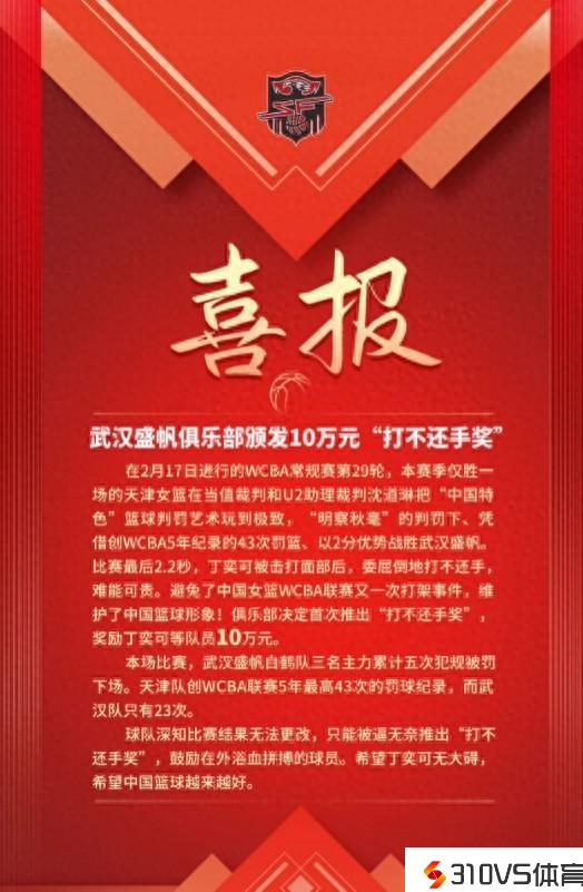 针对此事,武汉女篮官方公告写道:“丁奕可被击打面部后,冤枉倒地打不还手屡见不鲜。防止了中国女篮WCBA联赛又一次打架事情,维护了中国篮球笼统!俱乐部决议初次推出“打不还手奖”奖励丁奕可等队员10万元……球队深知竞赛结果无法更改,只能被逼无法推出打不还手奖,鼓舞在外浴血拼搏的球员。”