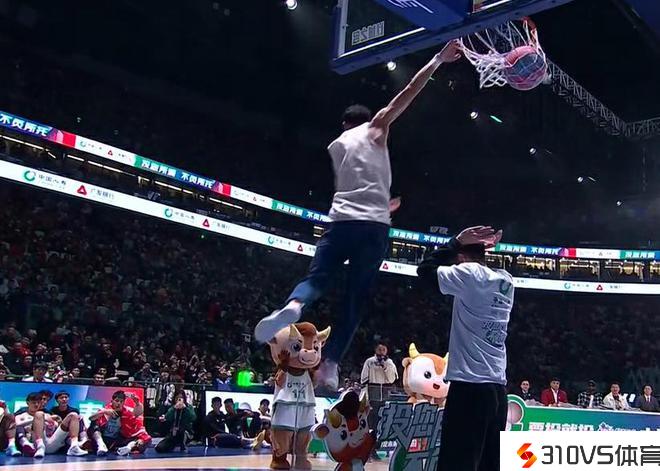第二个出场的万磊,从底角启动在空中飞跃两个阻碍物,发扬的是白乔丹的招牌举措“蝎子摆尾”,接球背扣一次成功,一切评委都给了10分,万磊赢得了满分50分。