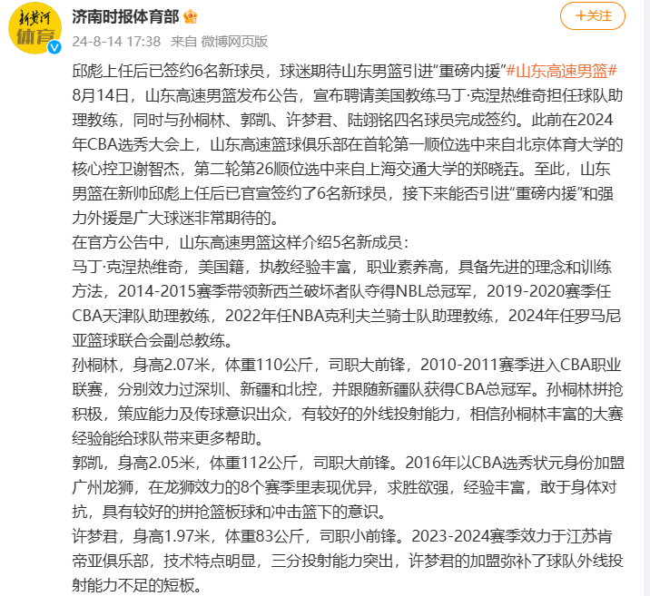 8月14日,山东高速男篮发布公告,宣布聘请美国教练马丁·克涅热维奇担任球队助理教练,同时与孙桐林、郭凯、许梦君、陆翊铭四名球员完成签约。此前在2024年CBA选秀大会上,山东高速篮球俱乐部在首轮第一顺位选中来自北京体育大学的核心控卫谢智杰,第二轮第26顺位选中来自上海交通大学的郑晓垚。至此,山东男篮在新帅邱彪上任后已官宣签约了6名新球员,接下来能否引进“重磅内援”和强力外援是广大球迷非常期待的。