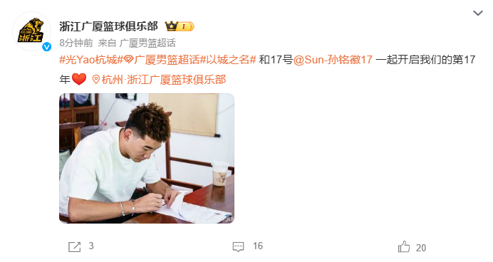 今日,浙江广厦男篮官方更新社媒宣布与球队核心孙铭徽续约并晒出一张孙铭徽签字的照片,原文如下。