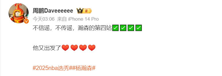 “在2024-25赛季的大部分时间里,2米16的杨瀚森都被视为“神秘球员”或“选秀+下放培养”的潜力股。人们一度怀疑他在CBA联赛的积极表现能否转换到NBA比赛中,但随着NBA选秀联合试训和Klutch体育经纪公司的ProDay的到来,大家对他的看法发生了改变。”