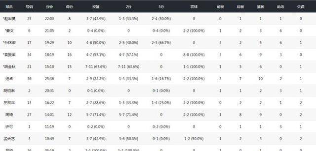 四川:周琦14分钟12分9篮板,胡金秋15分钟15分6篮板,孙铭徽10分5篮板6助攻,赵岩昊8分,袁振梁16分9篮板3助攻,