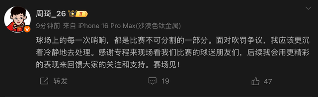 第二场比赛过后周琦发布动态回应了第一场被驱逐,他坦言自己以后会更加冷静处理类似情况:“球场上的每一次哨响,都是比赛不可分割的一部分。面对吹罚争议,我应该更沉着冷静地去处理。感谢专程来现场看我们比赛的球迷朋友们,后续我会用更精彩的表现来回馈大家的关注和支持。赛场见!”