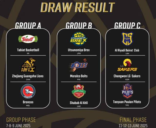 2025年的篮球亚冠联赛在6月7日-13日在迪拜举行,合计有9支球队参赛。小组赛阶段,各小组前两名与两支成绩最好的小组第三名,共8支球队晋级1/4决赛阶段赛事。如此一来,9支球队在小组赛阶段仅会淘汰战绩最差的一队。