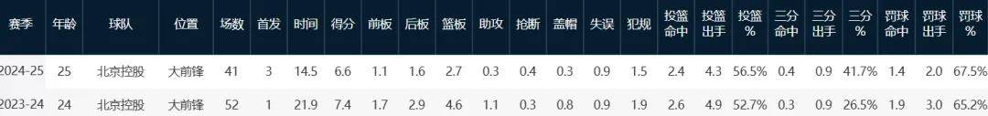 然而到了二年级即24-25赛季,随着沈梓捷和萨林杰的到来,以及外援政策改为4节7人次,陈国豪在北控队的上场时间被极大压缩,常规赛场均上阵14.4分钟贡献6.6分2.7板;季后赛场均仅上阵6.8分钟拿下2.8分0.5板。