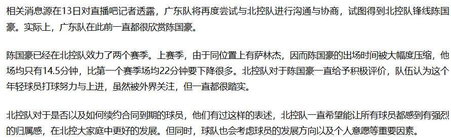 国内知名篮球平台报道:广东队再度尝试得到陈国豪。