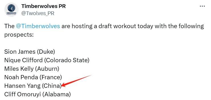 北京时间6月17日,森林狼官方公布了球队新一轮试训名单,其中一个熟悉又令人振奋的名字出现了——杨瀚森!