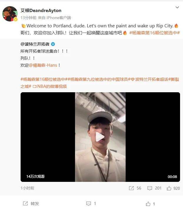 因此在杨瀚森被选中之后,艾顿第一时间就上来套近乎,祝贺杨瀚森。
