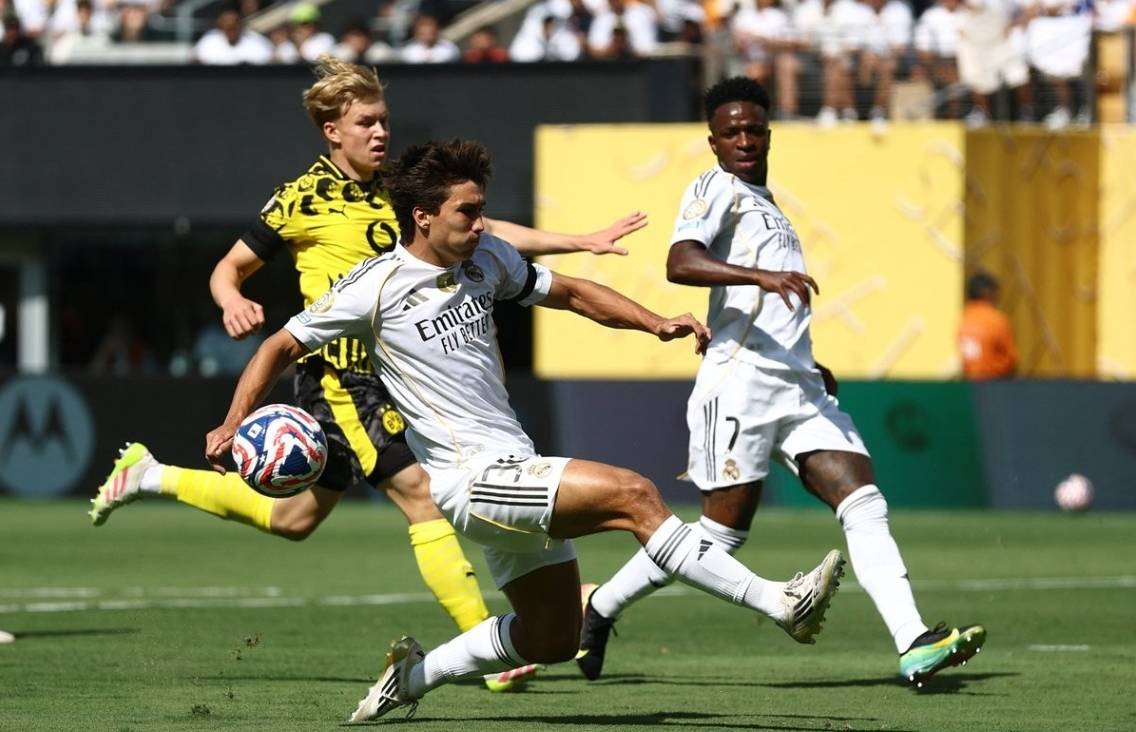 士气大振的皇马,在第20分钟扩大领先优势,新援阿诺德右路下底传中,后点包抄的弗兰加西亚推射建功,将比分改写为了2-0,半场比赛结束之前,皇马获得一次绝佳的反击机会,可惜维尼修斯的吊射没有能够命中目标。