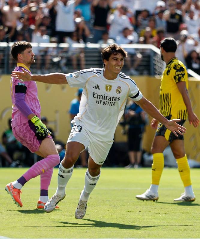 随着主裁判一声哨响,皇家马德里就在场面上完全压制住了大黄蜂,第7分钟边后卫弗兰加西亚杀到前场后,送出一脚质量非常高的传中,可惜门前包抄的贡萨洛加西亚没有调整好步伐,没有能够踢到皮球,错失进球良机,好在3分钟之后,他就弥补了遗憾,居勒尔左路送出45°传中,贡萨洛加西亚门前垫射,帮助皇马取得了1-0的领先。