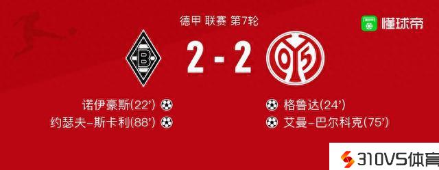 北京时间10月07日德甲 联赛 第7轮,门兴格拉德巴赫主场对阵美因茨。门兴格拉德巴赫诺伊豪斯破门,约瑟夫-斯卡利破门。美因茨格鲁达破门,艾曼-巴尔科克破门。最终比分2-2。
