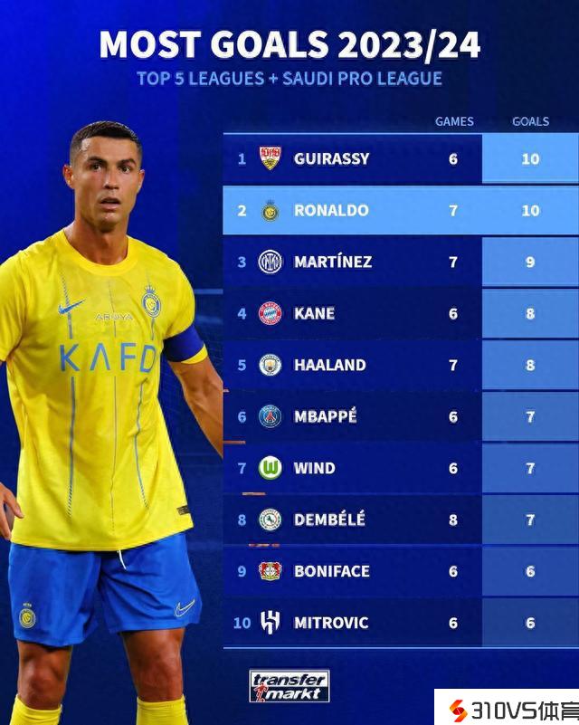 10月8日讯 在C罗、本泽马和内马尔等球星的加盟后,沙特联赛吸引了越来越多的关注,德转甚至统计了五大联赛+沙特联的射手榜。