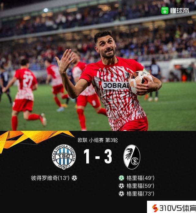 北京时间10月27日欧联 小组赛 第3轮,托波拉主场对阵弗赖堡。托波拉彼得罗维奇破门。弗赖堡格里福帽子戏法。最终比分1-3。