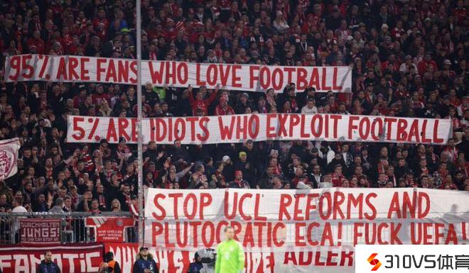 竞赛停止得进程中,拜仁球迷在看台举起标语支持欧冠改制。拜仁球迷的标语中写道:“95%的球迷爱着足球,而5%的白痴想榨干足球。中止欧冠改制!FXXX 欧足联!”