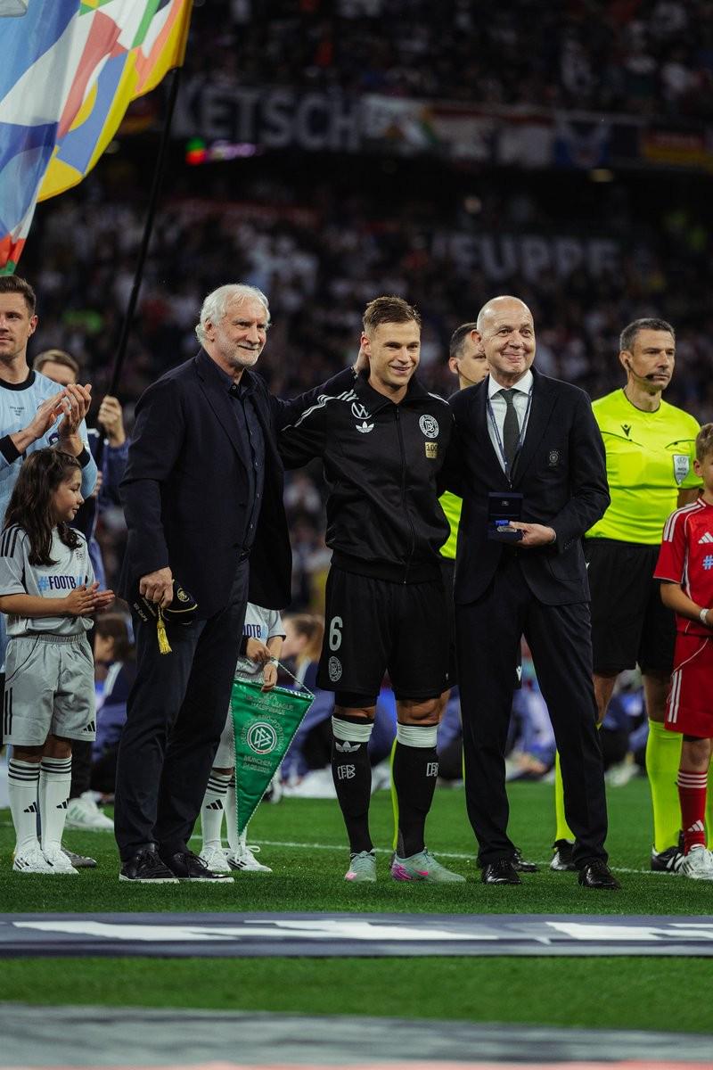 在与葡萄牙队的欧国联半决赛前,达成德国国家队百场里程碑的基米希获赠纪念礼物。