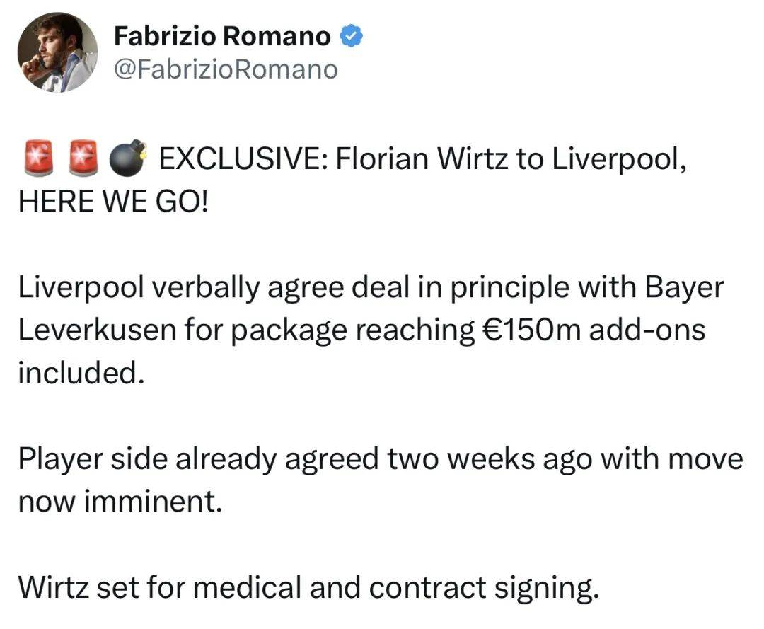 “利物浦与勒沃库森达成口头协议,维尔茨的转会费总价1.5亿欧。维尔茨在两周前就已同意转会,现在转会即将开始,维尔茨准备接受体检并签署合同。”
