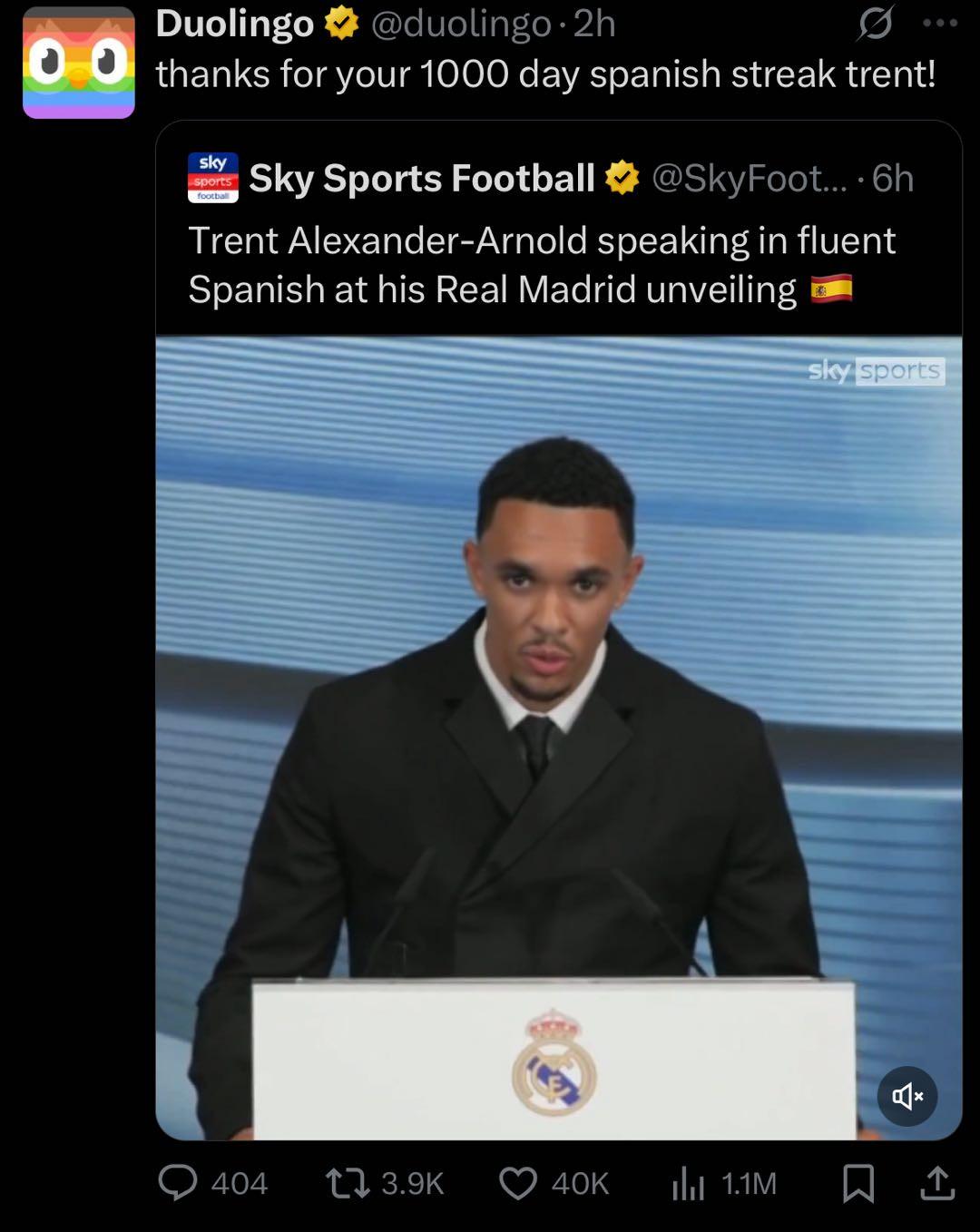 皇马新援阿诺德在亮相仪式中讲起了西语。多邻国官方随后打趣道,感谢你的一千天连续打卡。