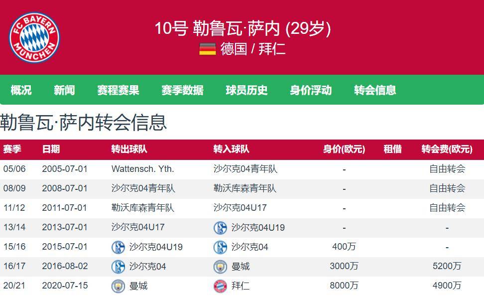 萨内在沙尔克04成长并成名,球员于2016年夏窗以5200万欧元的转会费加盟曼城,4年蓝月生涯135场39球44助;球员于2020年夏窗以4900万欧元的转会费加盟拜仁,5年拜仁生涯220场61球55助。