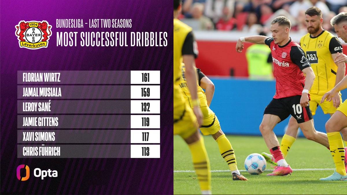 据Opta统计,勒沃库森中场维尔茨是近两个赛季德甲成功过人次数最多的球员,为161次。