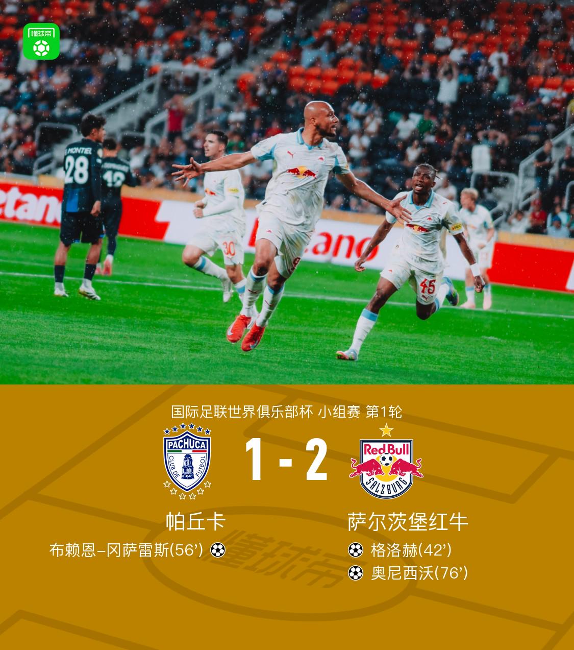 北京时间6月19日国际足联世界俱乐部杯 小组赛 第1轮,帕丘卡对阵萨尔茨堡红牛。上半场,龙东头球攻门击中横梁。祖尔茨巴赫尔助攻,格洛赫破门打破场上僵局。下半场,冈萨雷斯任意球直接破门扳平比分。比斯特鲁普传中,奥尼希沃头球破门再次将比分超出。最终,萨尔茨堡红牛2-1战胜帕丘卡。