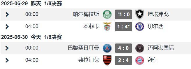 已经战罢的4场世俱杯1/8决赛:帕尔梅拉斯1-0博塔弗戈(巴甲内战)、本菲卡1-4切尔西(欧洲内战)、巴黎4-0迈阿密国际、弗拉门戈2-4拜仁(欧美对决)。特别是弗拉门戈vs拜仁的比赛中,德甲冠军淘汰了巴甲领头羊,展现了欧洲强队的风采。