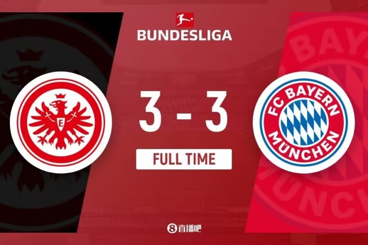 下半场伤停补时6分钟,全场比赛结束,最终拜仁3-3法兰克福。