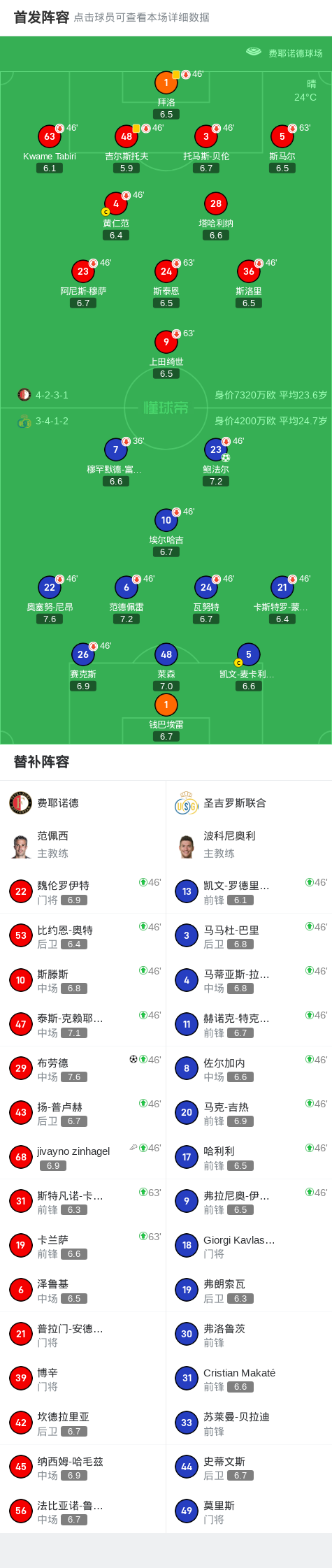 第72分钟,费耶诺德球员jivayno zinhagel助攻布劳德打入一球。