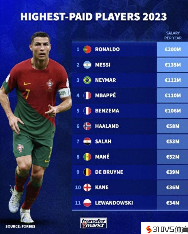 德转列出2023年足坛球员年薪排行榜,C罗年薪2亿欧元高居第一。