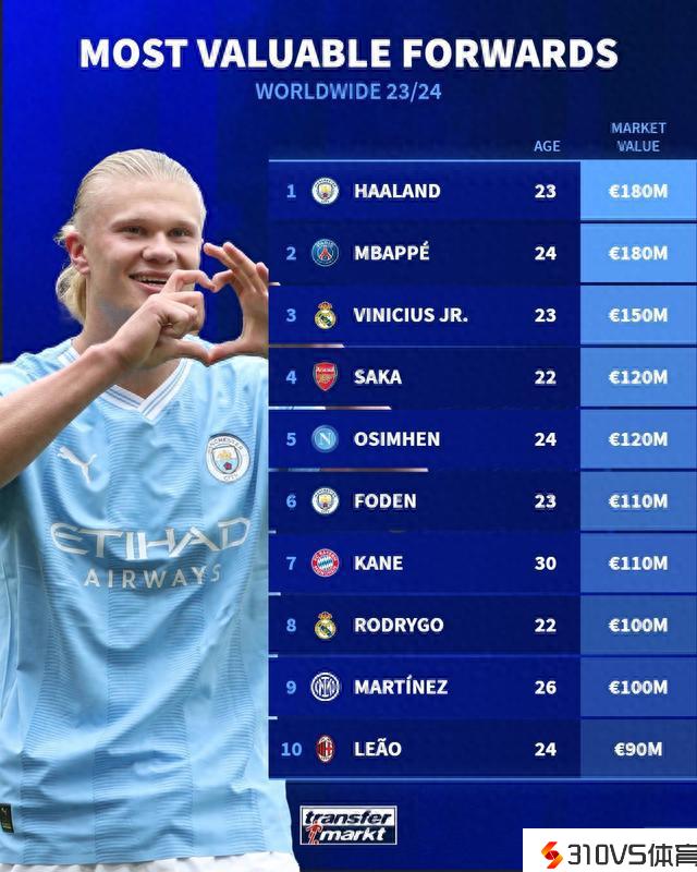 德转市场列出了23-24赛季世界足坛身价排行榜前十位的前锋,哈兰德姆巴佩均为1.8亿欧领衔该榜单。