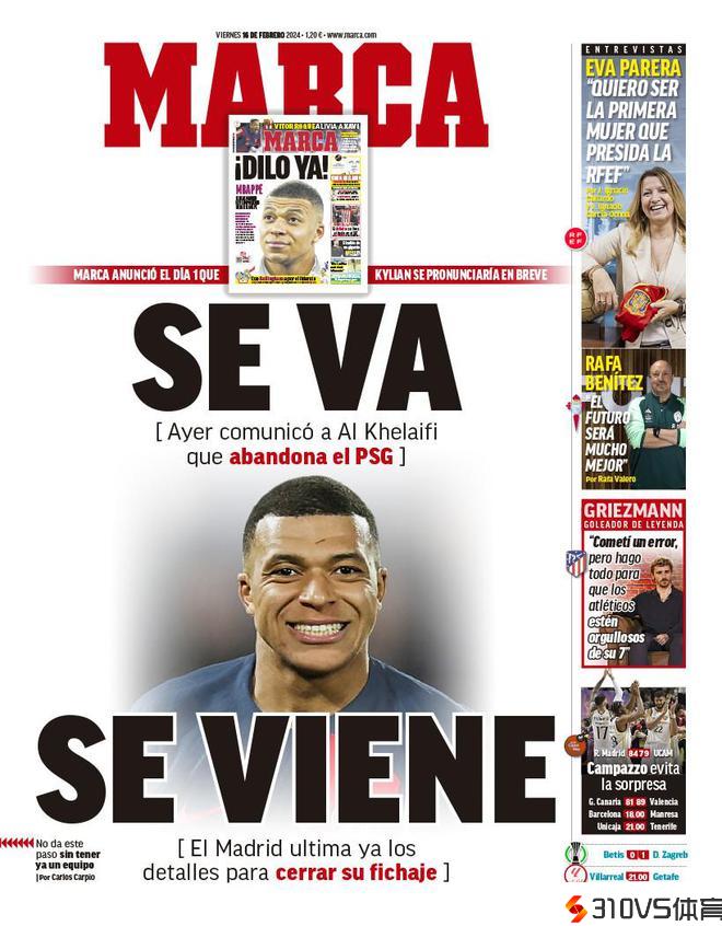 《马卡报》头版写道:“他要走了,他要来了。”昨日,姆巴佩曾经向巴黎主席纳赛尔传达了自己决议赛季完毕后分开球队的决议,而皇马目前正在敲定签约姆巴佩的细节。