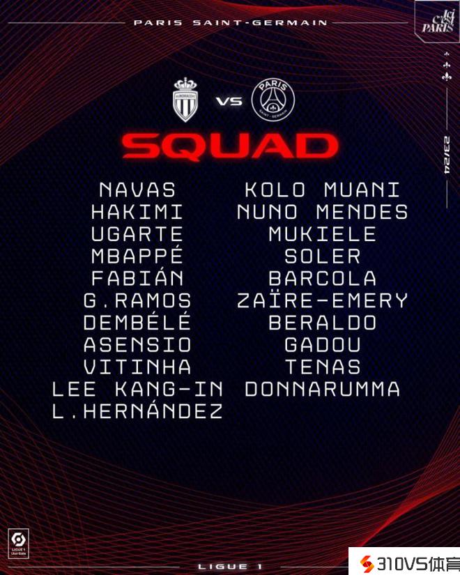 北京时间明天清晨4:00的法甲焦点战,巴黎将在客场对阵摩纳哥。赛前,巴黎发布了本场竞赛的大名单,其中,姆巴佩领衔锋线,李刚仁、登贝莱、阿什拉夫均中选。