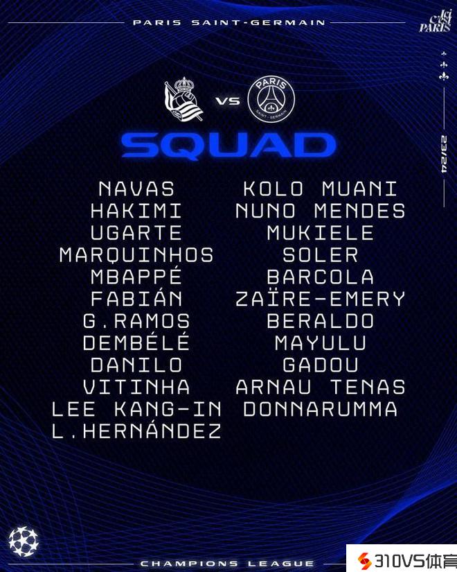北京时间3月6日周三清晨4点,巴黎将在欧冠1/8决赛次回合客场应战皇家社会,明天巴黎发布了大名单。
