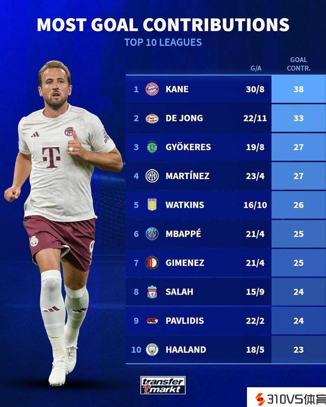 欧洲前10联赛赛季至今直接参与进球数前10球员: