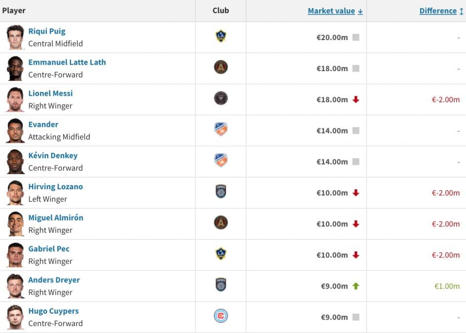 北京时间6月6日,德国转会市场公布了美职联球员的最新身价。其中普伊奇身价不变,依旧以2000万欧排名榜首,迈阿密国际球星梅西则下滑至1800万欧元,与亚特兰大联的拉特并列第二。