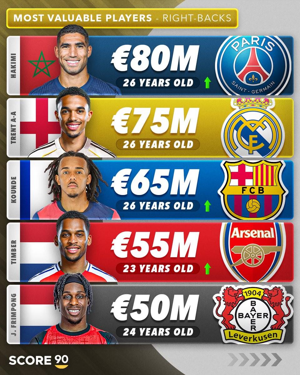 巴黎圣日耳曼的阿什拉夫位列榜首,身价达8000万欧元。皇马新援亚历山大-阿诺德以7500万欧元紧随其后,巴塞罗那的孔德身价为6500万欧元位列第三。阿森纳后卫廷贝尔和利物浦的弗林蓬分列第四和第五,身价分别为5500万欧元和5000万欧元。