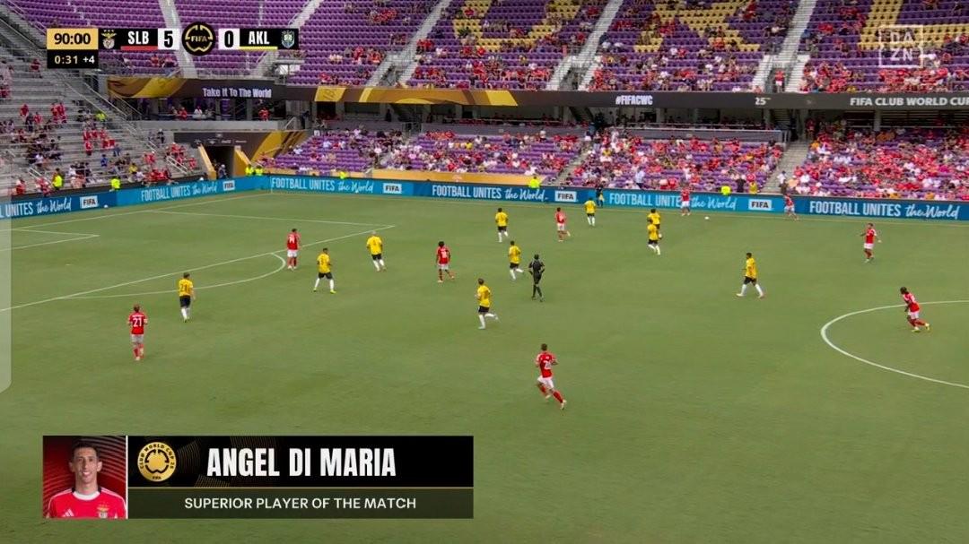 2025年世俱杯小组赛第二轮,本菲卡6-0击败奥克兰城,此役上演梅开二度的迪马利亚当选世俱杯官方全场最佳球员。