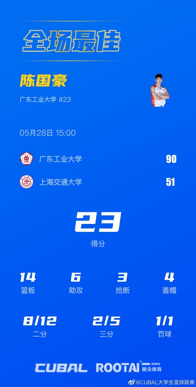 5月28日讯 CUBAL全国八强赛第二日比赛打响,广东工业大学坐镇主场迎战上海交通大学。根据CUBAL赛制规定,进入八强的对阵队伍之间要经过两轮主客场比赛,决出最终巅峰四强。