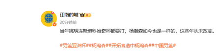 媒体人江南的城发文点评说道:“当年姚明连斯坦科维奇杯都要打,杨瀚森如今也是一样的,这些年从未改变。”