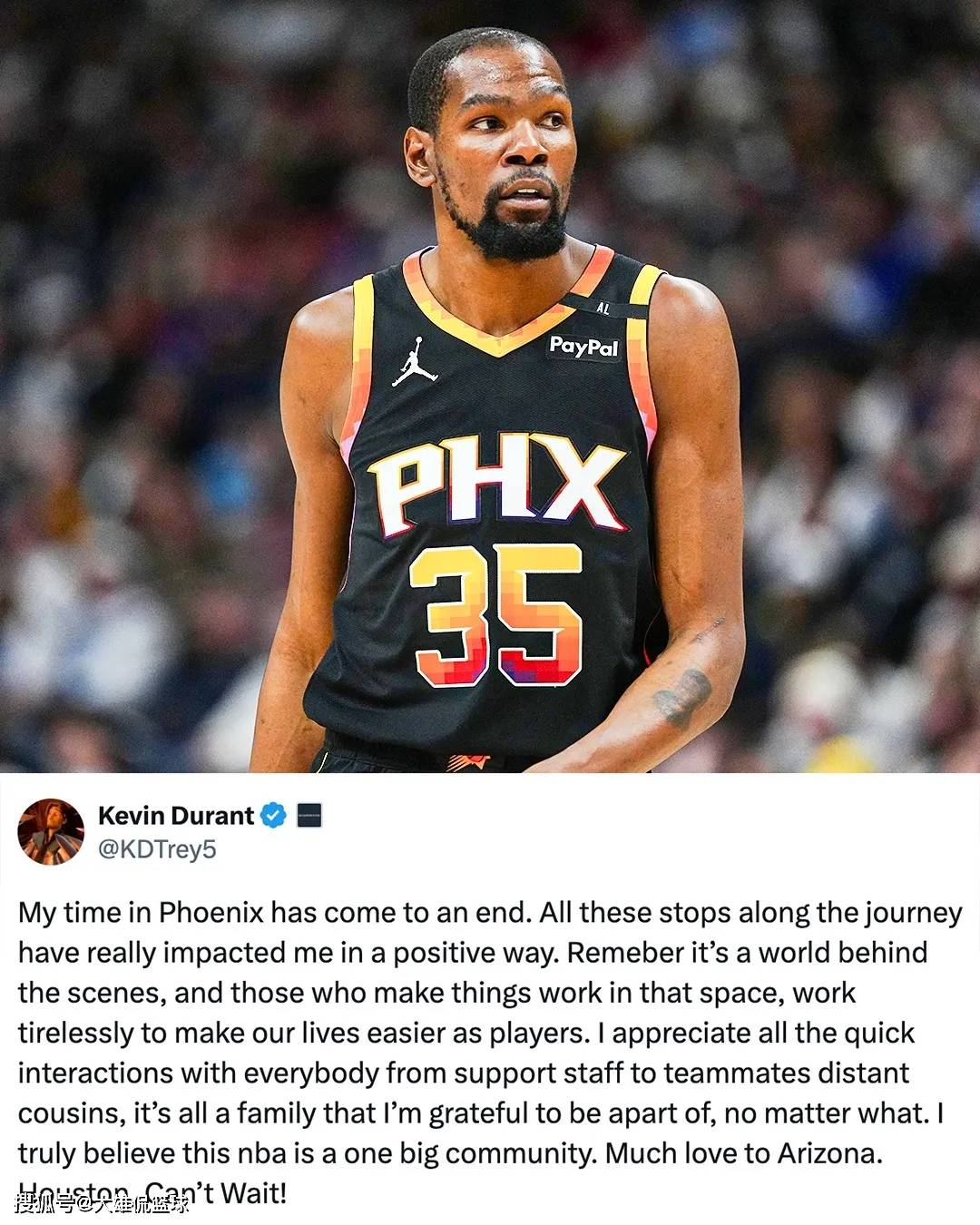 凯文杜兰特发文表示“我在菲尼克斯的日子已经结束了,旅途中的所有停留都给我带来了积极的影响。请记住,这是一个幕后的世界,那些让事情在那个空间中工作的人,不知疲倦地工作,让我们作为球员的生活更加轻松。我很感激与每个人的快速互动,从支持人员到队友,远房表亲,无论如何,这都是一个家庭,我很高兴成为其中的一员。我真的相信NBA是一个大社区。爱你的亚利桑那,休斯顿,等不及了!”