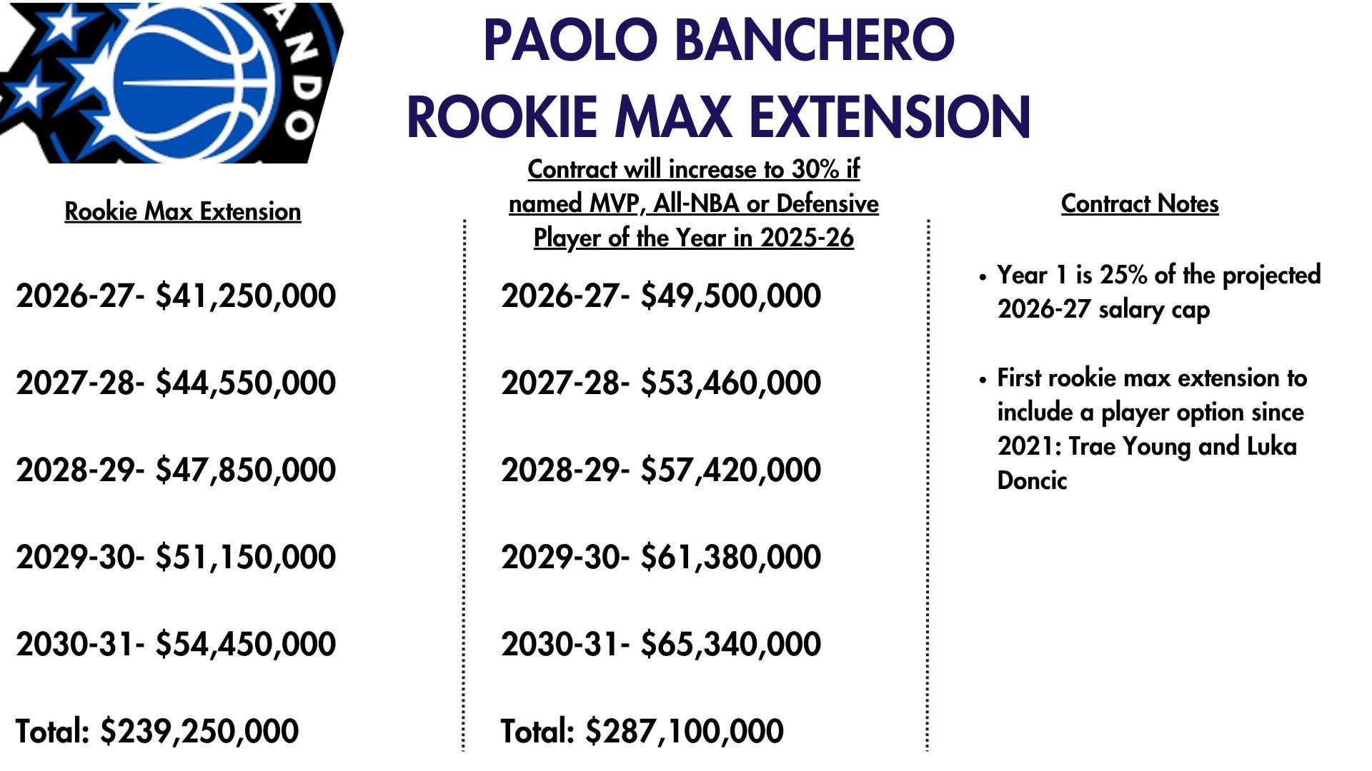 据NBA薪资专家Bobby Marks报道,班凯罗签下的2.87亿美元大合同是“指定新秀”合约,班凯罗若想全部拿到需要满足以下条件:在合同期内达成获得MVP、DPOY或入选最佳阵容三个条件之一,否则班凯罗的顶薪合同为5年2.39亿美元。也就是说满足条件的话班凯罗可以获得总计4800万美元的奖金。