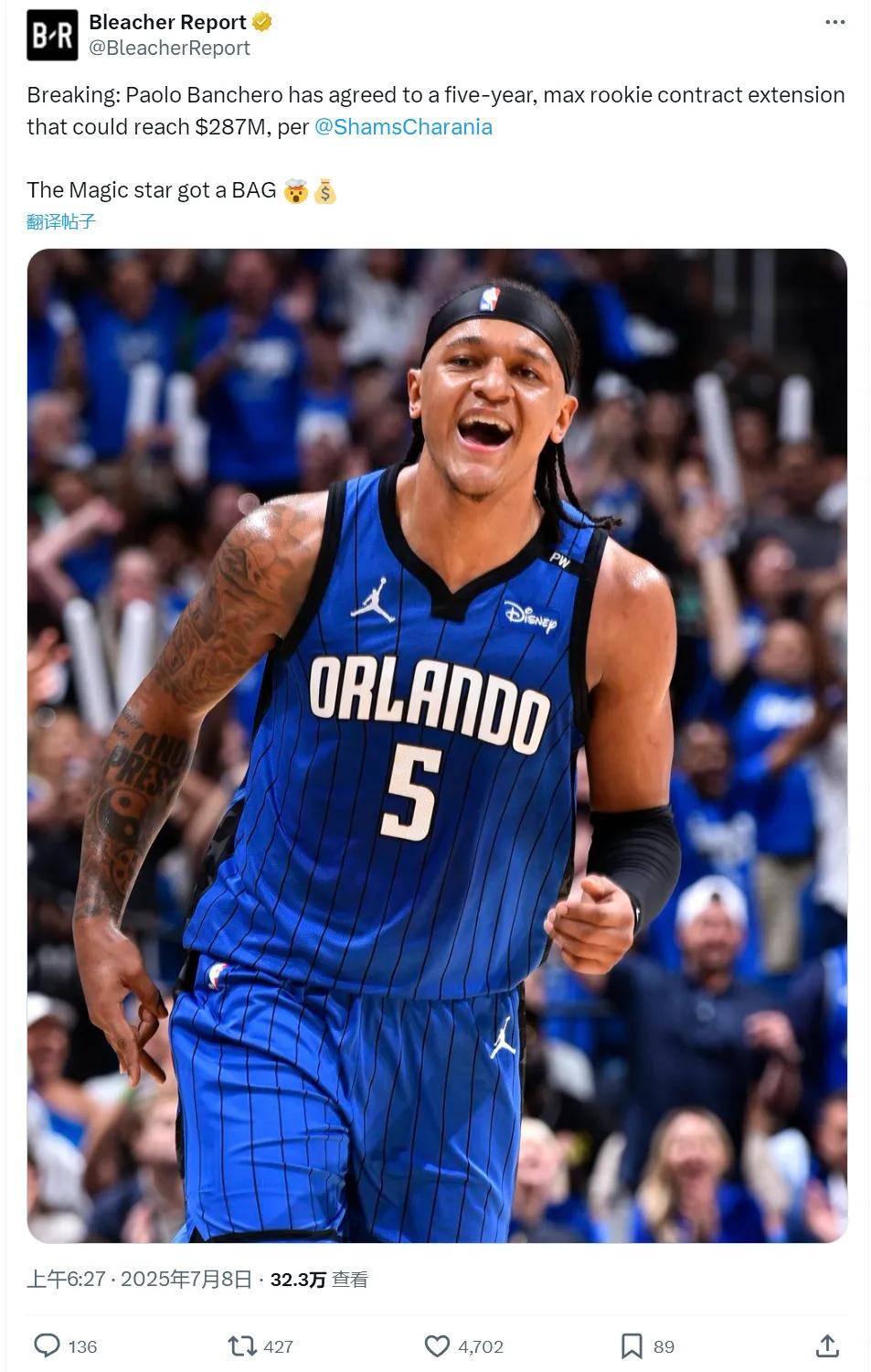 北京时间7月8日凌晨,据NBA名记Shams报道,班凯罗同意和魔术签下5年2.87亿美元的指定新秀续约合同。这份合同的保障金额5年2.39亿美元,如果班凯罗下赛季入选最佳阵容、拿到MVP或者DPOY,合同总额将变成2.87亿!