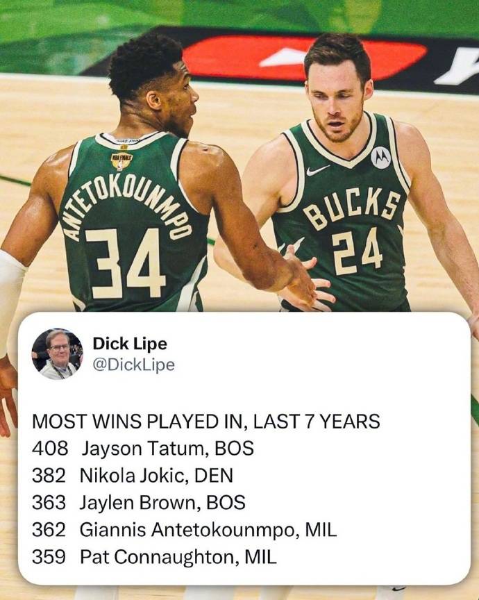 值得一提的是,过去7年胜场数最多的运动员前五分别是:塔图姆(408场)、约基奇(382场)、杰伦-布朗(363场)、字母哥(362场)、康诺顿(359场)。(搜狐体育编辑:JS)